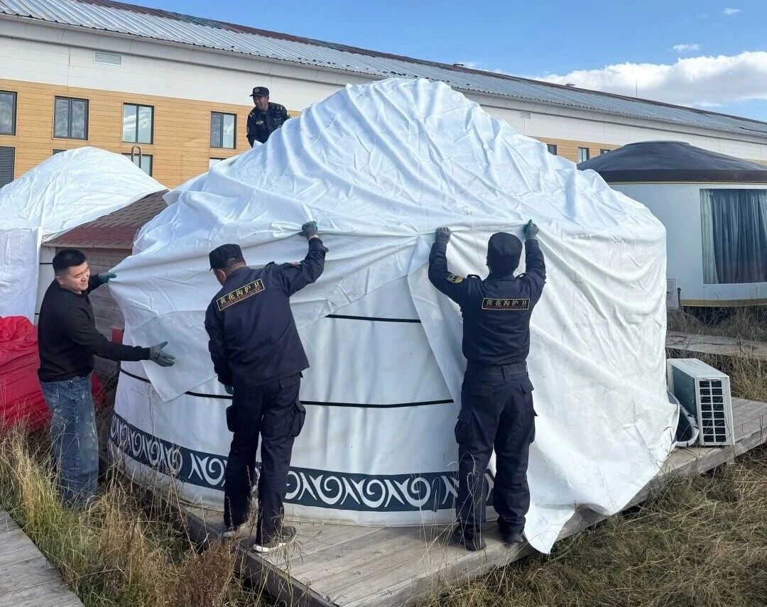 晨光微熹,薄霜如纱,酒店服务部与安保的同事们已踏着晨露,走向静立在草原上的蒙古包。他们的动作很轻,像为即将远行的孩子整理衣装——指尖抚过毡布每一处褶皱,为每个绳结多系一个安心的扣。白气在晨光中呵出温柔的弧线,仿佛在说:“冬安,待春归。”他们记得您推开门时眼里的光,他们知道,真正的守护,是让每一次重逢,都如初见般温暖如家。