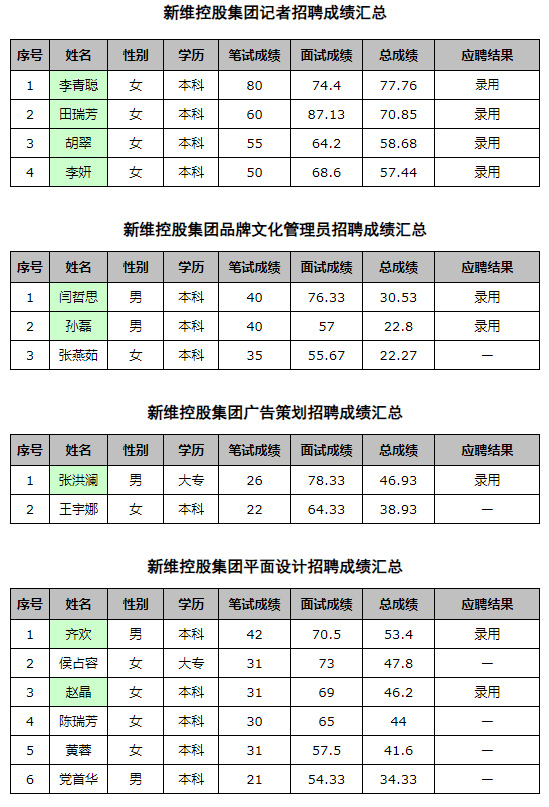 内蒙古新维控股集团2011年8月招聘成绩公示